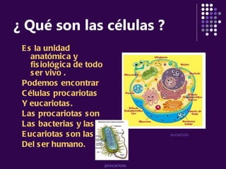 Las células son la unidad básica de los seres vivos. Existen dos tipos principales de células: procariotas y eucariotas. Las células eucariotas contienen orgánulos como el núcleo, mitocondrias, retículo endoplásmico y aparato de Golgi. Las células vegetales también contienen cloroplastos y una pared celular. La célula está organizada en niveles atómico, molecular y de orgánulos.