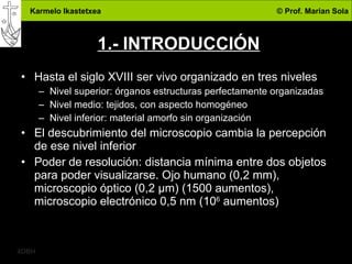 El documento describe la célula como la unidad básica de los seres vivos. Explica que las células pueden ser procariotas u eucariotas, y describe sus principales características y funciones como la nutrición, relación y reproducción. También detalla los diferentes niveles de organización biológica, desde lo subatómico hasta los ecosistemas, y cómo cada nivel emerge de las propiedades de los niveles inferiores.