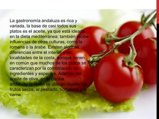La cocina de Andalucía se caracteriza por el uso abundante del aceite de oliva y los frutos del mar, debido a su ubicación y clima mediterráneos. Entre los platos típicos se encuentran el gazpacho, las frituras malagueñas y el pescado preparado de diversas formas, mientras que cada provincia ofrece especialidades como el arroz en Almería o los cerdos ibéricos en Huelva. La gastronomía andaluza es rica y variada, con influencias romanas, árabes y de