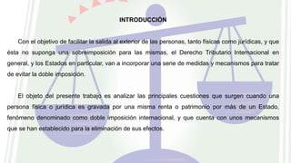 Este documento analiza los problemas de la doble imposición internacional y los mecanismos para evitarla, como los tratados y convenios internacionales. Explica las causas de la doble imposición, como la utilización de diferentes criterios de sujeción fiscal o la interpretación distinta de conceptos como la residencia fiscal. También describe entidades internacionales relacionadas con el derecho tributario y factores que afectan la integración latinoamericana.