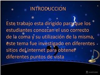 Este documento proporciona una guía sobre el uso correcto de la coma. Explica que la coma es un signo de puntuación que indica una breve pausa dentro de una oración o para separar oraciones y frases relacionadas con el mismo tema. Luego detalla los usos principales de la coma, como separar elementos en una lista, hacer incisos, separar complementos circunstanciales, y separar expresiones de enlace. Finalmente, concluye que la coma sirve para hacer pausas breves y separar diferentes elementos dentro de un texto.