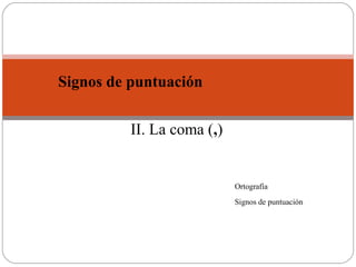 Este documento describe las funciones y usos de la coma en la escritura. Explica que la coma indica una pausa breve y separa elementos como los términos de una enumeración, las oraciones incidentales, las construcciones condicionales y más. También describe casos en los que la coma se omite, como entre el sujeto y el verbo o entre palabras reduplicadas.