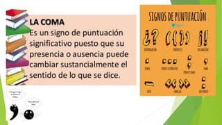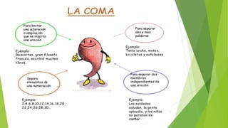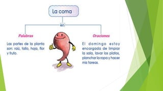 El documento habla sobre el uso de las comas en las oraciones. Explica que las comas se utilizan para separar elementos de una enumeración o para separar el nombre de una persona de otra parte de la oración. También incluye un poema como ejemplo y una actividad sobre el uso de comas.