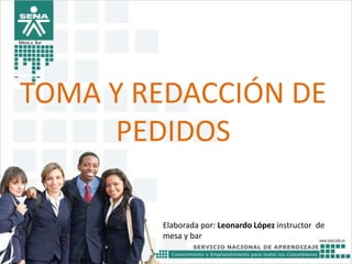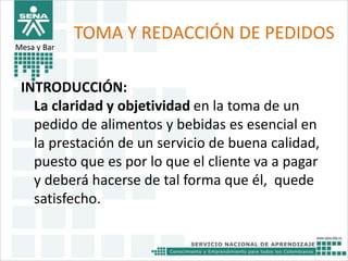 Este documento proporciona información sobre cómo tomar y registrar pedidos en un restaurante. Explica que la toma de pedidos debe ser clara y precisa para satisfacer al cliente. Detalla el proceso de tomar el pedido, incluyendo enumerar a los clientes, escribir los platos pedidos y separarlos por categoría, y entregar la orden a la cocina y caja. También cubre términos de cocción y cómo organizar la comanda.