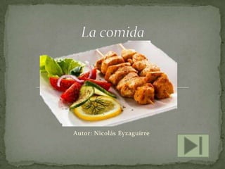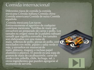 El documento presenta una lista de diferentes tipos de comida como la mexicana, italiana, china, americana y suiza. Describe brevemente algunos platillos típicos de la comida mexicana como los tacos, tamales y pozole. También habla sobre la fusión culinaria en la cocina peruana y los diferentes orígenes de los ingredientes y técnicas utilizadas. Finalmente, realiza una clasificación general de los tipos de comida entre nacional e internacional, y destaca la importancia de comer alimentos saludables.