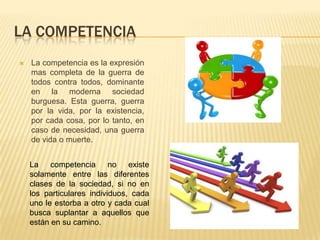 El documento analiza la competencia en la sociedad burguesa, describiendo cómo el proletariado vive en una constante lucha por la supervivencia bajo el control de la burguesía. Se detalla la explotación laboral y cómo la competencia entre trabajadores y capitalistas influye en la determinación de salarios y condiciones de vida. Además, se menciona el fenómeno de la sobrepoblación y la creciente miseria entre los desempleados, que recurren a la mendicidad en tiempos de crisis.