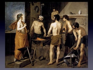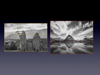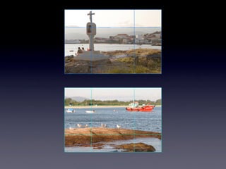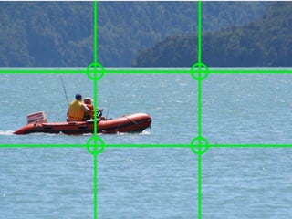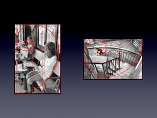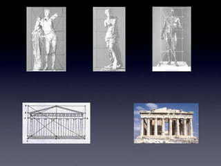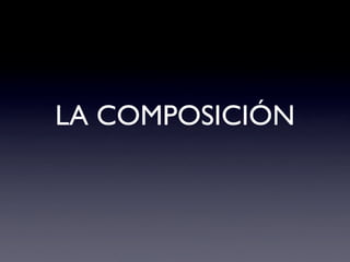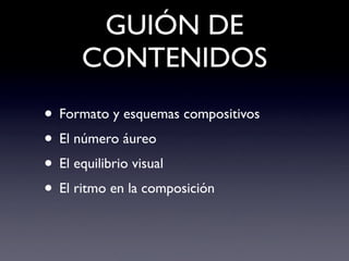 Este documento describe los principios básicos de la composición en el arte, incluyendo el formato, el número áureo, el equilibrio visual y el ritmo. Explica que la composición implica organizar varios elementos con cierto orden y modo. Luego discute cómo el formato vertical enfatiza la elevación mientras que el horizontal promueve la calma. También describe la sucesión de Fibonacci y la espiral de Durero como ejemplos del número áureo y cómo este principio se ha aplicado en obras maestras. Finalmente, resalta la importancia del ritmo