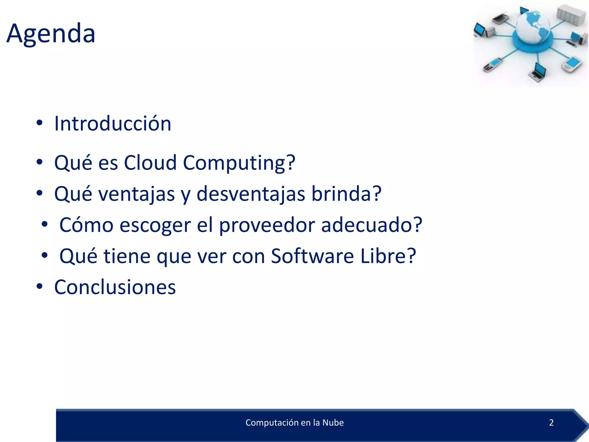 El documento proporciona una introducción a la computación en la nube. Explica que la computación en la nube permite acceder a información y aplicaciones almacenadas en servidores remotos a través de Internet. Detalla algunos tipos de servicios en la nube como SaaS, computación utilitaria y plataformas de servicios. También discute ventajas y desventajas de la computación en la nube y el papel del software libre en este campo emergente.