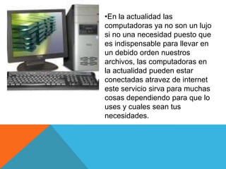 Las computadoras ya no son un lujo sino una necesidad indispensable para llevar el orden de archivos y estar conectado a través de Internet. El Internet tiene beneficios como la investigación y comunicación, pero también riesgos como hackers y piratas. Las computadoras han influido en muchos aspectos de la vida debido a su capacidad de realizar múltiples tareas y han sido el resultado de extensos proyectos de investigación para resolver problemas de manera rápida.