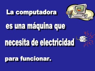 La computadora necesita electricidad para funcionar y se utiliza en diferentes lugares como colegios, casas y oficinas. El CPU es el cerebro de la computadora y le permite realizar operaciones, mientras que el monitor nos permite ver la información. El teclado y el mouse nos permiten ingresar información e interactuar con la computadora, respectivamente. La computadora también trabaja con periféricos como la impresora, que permite imprimir el trabajo, y el scanner, que permite ingresar fotos y texto a la computadora.