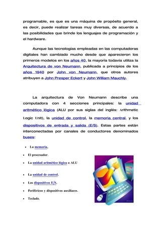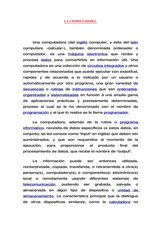 Una computadora es una máquina electrónica que recibe datos, los procesa y los convierte en información útil mediante la ejecución de programas. Se compone de circuitos integrados y otros componentes que pueden ejecutar rápidamente instrucciones de forma precisa según lo indicado por un usuario o programa. Requiere datos de entrada específicos y programas para procesar la información y generar una salida final.