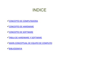 Este documento presenta un índice sobre los conceptos clave de una computadora, incluyendo definiciones de hardware, software, y sus componentes principales. También incluye un mapa conceptual que ilustra los elementos que conforman un equipo de computo, dividiendo el hardware en interno, externo, almacenamiento, entrada y salida.