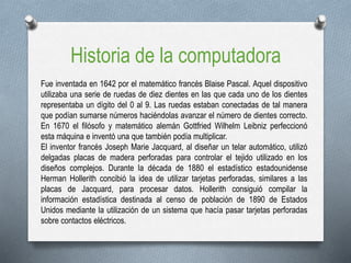 La computadora fue inventada en 1642 por Blaise Pascal. Las primeras computadoras analógicas se construyeron a principios del siglo XX y usaban ejes y engranajes. Cinco generaciones de computadoras se han desarrollado desde entonces, cada una más pequeña, rápida y eficiente que la anterior a medida que la tecnología avanzaba desde los tubos de vacío a los circuitos integrados y los microprocesadores.