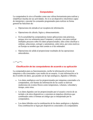 El documento describe las funciones básicas de una computadora, incluyendo la computación, las partes principales como la unidad central de procesamiento, la memoria y los dispositivos de entrada y salida. También explica los diferentes tipos de datos, memorias y el teclado de una computadora personal.