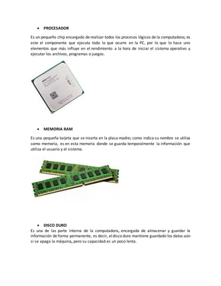La computadora está compuesta de partes internas como la fuente de alimentación, la tarjeta madre, el procesador, la memoria RAM, el disco duro y la tarjeta de video, entre otras. Está hecha de materiales como vidrio, cobre, aluminio y plástico. Su función principal es procesar información mediante programas y tiene aplicados principios de las primeras generaciones de computadoras basadas en tubos de vacío y circuitos de transistores.