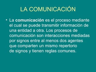 La comunicación implica la transmisión de información de un emisor a un receptor a través de un canal y código. Requiere un emisor que transmite el mensaje, un receptor que lo recibe e interpreta, un código de signos compartidos, y un canal o medio físico para la transmisión. El contexto o situación también contribuye al significado del mensaje.