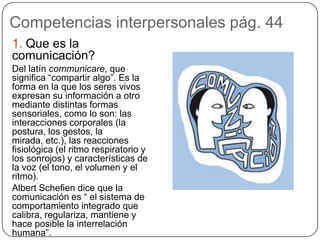 El documento habla sobre dos tipos de comunicación: directa e indirecta. La comunicación directa se caracteriza por ser cara a cara sin intermediarios, utilizando lenguaje no verbal como gestos y tono de voz. La comunicación indirecta involucra distancia espacial o temporal entre emisor y receptor y se realiza a través de medios como teléfono o internet. También menciona aspectos de la comunicación organizacional y efectiva como la adaptación del lenguaje y claridad de objetivos.