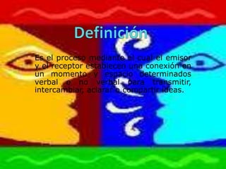 La comunicación implica la transmisión de información entre un emisor y receptor a través de un canal y código compartido. Incluye elementos como el emisor, receptor, mensaje, canal y contexto. Existen formas lingüísticas como la verbal y escrita que dependen del lenguaje, y no lingüísticas como la visual, auditiva y gestual que no necesitan lenguaje. Las ciencias de la comunicación estudian este proceso desde perspectivas como la psicología, sociología y lingüística.
