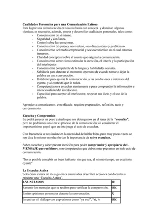 Para que exista comunicación se requiere enviar y comprender un mensaje entre dos personas que interactúan e intercambian información. Una comunicación exitosa requiere cualidades personales como la escucha activa, la atención y la tolerancia. La cortesía, el trato y evitar factores como la apatía, el desinterés o la agresividad también son importantes para lograr conversaciones efectivas.