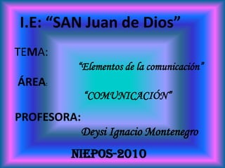 El documento presenta los elementos clave de la comunicación: emisor, mensaje, canal, código, contexto y receptor. El emisor envía el mensaje a través de un canal usando un código compartido dentro de un contexto, y el receptor recibe el mensaje. El documento evalúa el conocimiento sobre estos elementos a través de preguntas de selección múltiple.