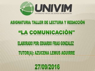 Este documento habla sobre la comunicación, que ha sido importante para el desarrollo social desde el principio de la humanidad. Explica que la comunicación puede ser entre humanos, organismos vivos o dispositivos tecnológicos. También describe el proceso comunicativo entre un emisor y receptor, y varios modelos de comunicación como los de Aristóteles, Lasswell, Shannon y Berlo. Finalmente, concluye resaltando la importancia de la comunicación en diferentes aspectos como la oral, escrita y virtual.