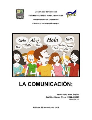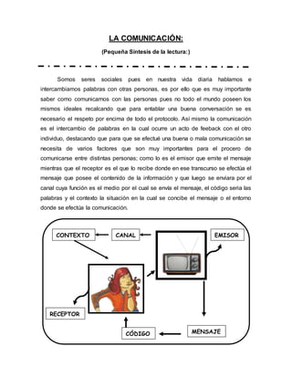 La comunicación es fundamental para los seres humanos como seres sociales. Para que la comunicación sea efectiva, se requiere del emisor, receptor, mensaje, canal y código, así como considerar el contexto. La lectura enseña la importancia de comunicarse con respeto, escuchando activamente y hablando de una manera positiva.