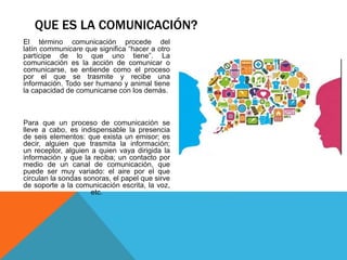 El documento trata sobre la comunicación. Define la comunicación como el proceso de transmitir y recibir información entre un emisor y receptor. Explica que para que ocurra la comunicación se requieren seis elementos: un emisor, receptor, mensaje, canal, feedback y contexto. Luego describe diferentes tipos de comunicación como directa, indirecta, descendente, ascendente y horizontal. Finalmente, cubre formas de comunicación como visual, oral y escrita.