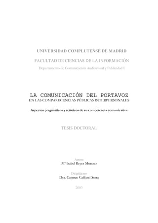 Este documento presenta la memoria de una tesis doctoral sobre la comunicación del portavoz en comparecencias públicas interpersonales. Se analizan los aspectos pragmáticos y retóricos de la competencia comunicativa del portavoz. La tesis está dirigida por la Dra. Carmen Caffarel Serra y fue presentada en la Universidad Complutense de Madrid en 2003 para optar al grado de doctor.