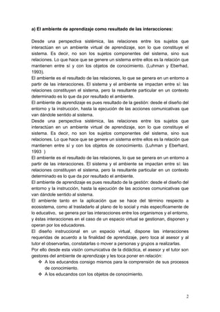 Este documento discute tres nociones clave para adoptar un paradigma comunicativo en entornos virtuales de aprendizaje: 1) que el ambiente de aprendizaje es el resultado de las interacciones entre los participantes, 2) la importancia de la mediación para gestionar estas interacciones, y 3) la naturaleza dialógica necesaria para la educación.
