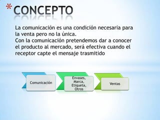 Este documento describe los diferentes elementos de la comunicación como emisor, mensaje, código, canal y receptor. Explica que la comunicación es necesaria pero no suficiente para las ventas y que debe ser efectiva para que el receptor entienda el mensaje. También distingue entre comunicación interna, dirigida a empleados, y externa, dirigida a públicos externos usando canales masivos o individuales como marketing, relaciones públicas o publicidad.