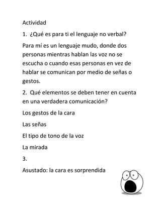 Este documento describe el lenguaje no verbal y los elementos importantes de la comunicación efectiva. Explica que el lenguaje no verbal es una forma de comunicación sin palabras a través de gestos y señas. Además, identifica los gestos faciales, las señas, el tono de voz y la mirada como elementos clave de toda comunicación verdadera. Finalmente, proporciona ejemplos de diferentes emociones y sus expresiones faciales asociadas.
