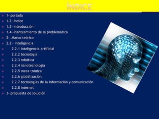 Este documento presenta una propuesta de solución de un equipo de estudiantes. Incluye una introducción, marco teórico sobre inteligencia artificial, tecnología, robótica, nanotecnología, mecatrónica, globalización, TIC e Internet. Finalmente, propone una solución basada en cómo la inteligencia artificial ha facilitado las tareas humanas y acelerado la globalización, aunque nunca podrá igualar la capacidad de razonamiento humano.