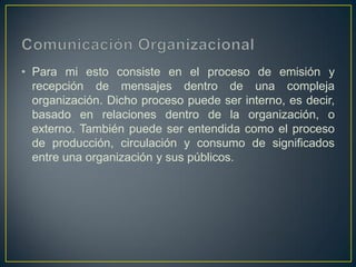 La comunicación consiste en el proceso de emisión y recepción de mensajes dentro y fuera de una organización. Es un componente esencial para el éxito de una organización ya que permite la comunicación interna, intergrupal y externa. Existen diferentes tipos de comunicación como la directa, que es inmediata, y la indirecta, que usa instrumentos a distancia.