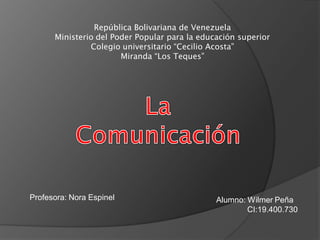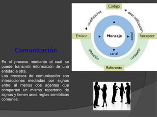 Este documento presenta los conceptos clave de la comunicación, incluyendo los tipos de comunicación, componentes, factores y elementos de la comunicación como el emisor, receptor, mensaje, código, canal y contexto. Explica brevemente cada uno de estos conceptos y provee una bibliografía al final.