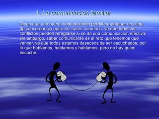 El documento describe la importancia de la comunicación familiar y los diferentes tipos y aspectos de la comunicación. Explica que la comunicación es fundamental para mantener una relación sana y resolver conflictos. También discute cómo la comunicación se da a través de mensajes verbales y no verbales y la importancia de comunicarse en el momento y lugar adecuados.
