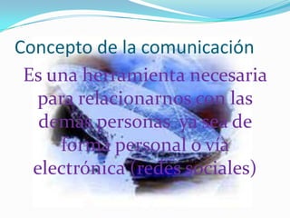 La comunicación implica compartir información entre personas a través de palabras, señales o escritura. Es una herramienta esencial para relacionarse tanto personalmente como a través de redes sociales. El proceso de comunicación involucra tres pasos sencillos: un emisor envía un mensaje codificado, que es recibido e interpretado por un destinatario.
