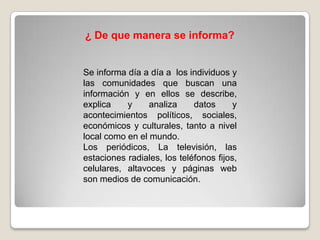 Este documento describe los diferentes tipos de medios de comunicación, cómo se usan para informar a las personas y comunidades, y cómo se dividen. Los medios de comunicación incluyen televisión, radio, periódicos e internet, y se usan para informar sobre eventos políticos, sociales, económicos y culturales a nivel local y mundial. Se pueden dividir en medios audiovisuales, radiofónicos, impresos y digitales dependiendo de su formato, o en informativos, de entretenimiento, de análisis y especializados dependiendo de
