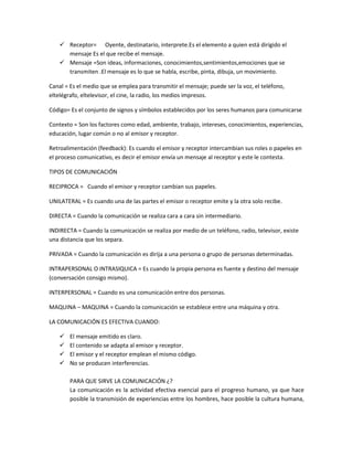 Este documento proporciona una introducción general sobre el tema de la comunicación. Define la comunicación como un proceso bidireccional que implica un emisor, mensaje y receptor. Explica los elementos clave de un proceso comunicativo como el emisor, receptor, mensaje, canal y código. Además, distingue entre diferentes tipos de comunicación como la comunicación recíproca, unilateral, directa e indirecta. Finalmente, enfatiza la importancia de la comunicación efectiva y las normas para ser buenos emisores y receptores en el proceso comunicativo.