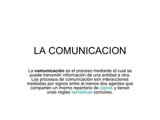 La comunicación es el proceso de transmitir información entre dos entidades mediante un mensaje, código y canal. El mensaje proporciona la información, el código es el conjunto de signos y reglas conocidos por el emisor y receptor, y el canal es el soporte material por el que circula el mensaje.