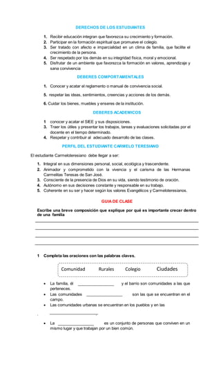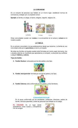 El documento describe la importancia de las comunidades y las diferentes formas en que se manifiestan, destacando la familia como la primera comunidad que conocemos. Se explican los tipos de familias, los derechos y deberes de los estudiantes en una comunidad escolar, así como la importancia de establecer normas para una convivencia armónica. También se menciona la estructura del gobierno escolar y la introducción a los conceptos de espacios urbanos y rurales.
