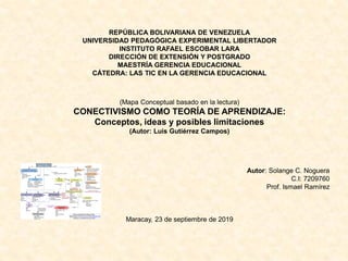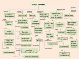 El documento explora el conectivismo como teoría del aprendizaje, destacando sus principios y propuesta pedagógica en el contexto de la educación y el aprendizaje continuo. Se enfoca en la importancia de las conexiones entre redes y la pluralidad en la adquisición de conocimiento. Además, aborda temas como el aprendizaje informal, organizacional y la brecha digital en el acceso a internet.