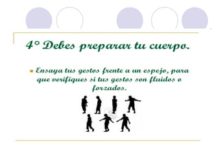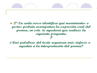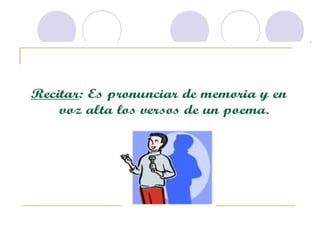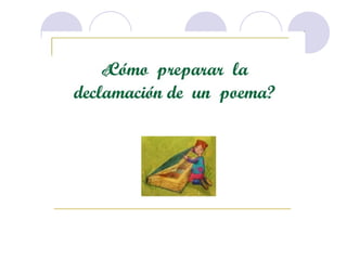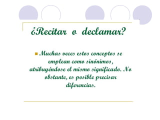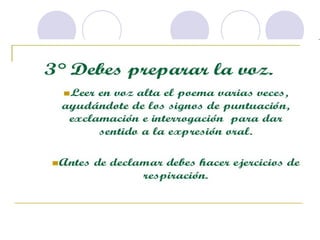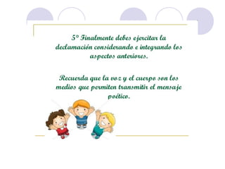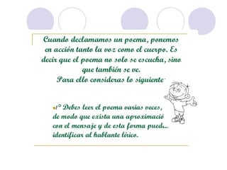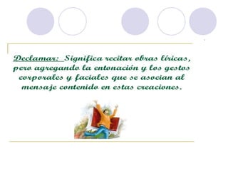 Este documento describe la declamación, que es el arte de interpretar poesía frente a un público. Explica que el declamador recita el poema con la entonación adecuada, mientras que el poeta es el autor del poema. Además, detalla elementos como la dicción, la mímica y la voz que debe dominar el declamador, así como consejos sobre la presentación, los gestos y la utilización de la voz para transmitir ideas y sentimientos al público de manera efectiva.