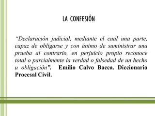 Este documento define la confesión y sus características principales. Explica que la confesión es una declaración judicial en la que una parte reconoce total o parcialmente la verdad o falsedad de un hecho u obligación en perjuicio propio. Detalla las condiciones esenciales de la confesión como la capacidad y espontaneidad del confesante, y clasifica las confesiones en judiciales y extrajudiciales, espontáneas y provocadas. Finalmente, establece el fundamento constitucional de la confesión y define la confes