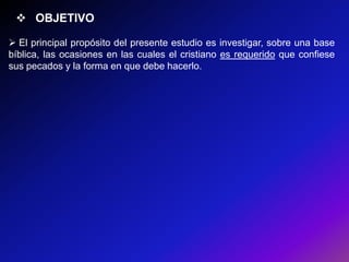 El documento examina la confesión de pecados en el contexto cristiano, fundamentándose en principios bíblicos sobre la necesidad de confesar faltas, especialmente cuando afectan a otros, y cómo esto impacta la relación con Dios y la comunidad. Se destaca que los pecados contra otros requieren una confesión a la persona ofendida, mientras que los pecados ocultos deben ser confesados únicamente a Dios. Finalmente, se establece que, en casos de pecados públicos, la confesión debe ser realizada ante la comunidad como parte del proceso de arrepentimiento y restauración.