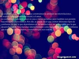 El documento define la confianza como la opinión favorable en la capacidad de otra persona u objeto para actuar correctamente. Explica que existen diferentes tipos de confianza, como la confianza en otros, la autoconfianza, y la confianza en instituciones. Además, identifica tres grados de confianza: el exceso de confianza, la desconfianza, y la pérdida total de confianza. El documento enfatiza que la confianza es difícil de obtener pero fácil de perder, y casi imposible de recuperar una vez per