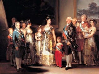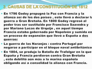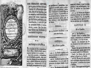 Este documento resume la sociedad española a principios del siglo XIX, las causas de la Constitución de 1812, la guerra de independencia y el contenido de la Constitución. Explica que la Constitución estableció por primera vez la soberanía nacional y la división de poderes. También incorporó el derecho a la educación y estableció escuelas de enseñanza primaria en todos los pueblos. Sin embargo, cuando Fernando VII regresó en 1814 derogó la Constitución y restauró el Antiguo R