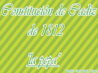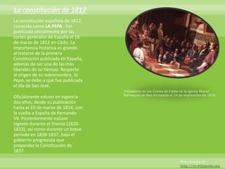 La constitución española de 1812, conocida como La Pepa, fue la primera constitución española y una de las más liberales de su época. Estuvo vigente oficialmente de 1812 a 1814 y luego brevemente en 1820-1823 y 1836-1837. El documento también describe a dos figuras históricas importantes durante ese período, Evaristo Pérez de Castro y Diego Muñoz Torrero.
