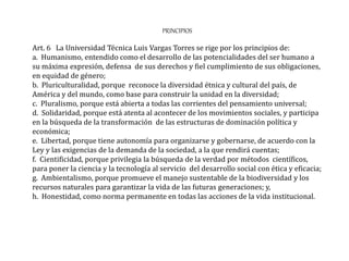 La constitución describe la creación y principios de la Universidad Técnica Luis Vargas Torres en Ecuador. Establece que la universidad fue creada en 1970 por ley para proporcionar educación superior de manera autónoma y sin fines de lucro, guiada por principios como el humanismo, la pluralidad y la cientificidad. Los objetivos de la universidad incluyen formar profesionales y líderes para contribuir al desarrollo del país a través de la docencia, investigación e interacción con la comunidad.