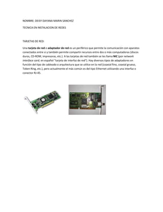 La tarjeta de red o adaptador de red permite la comunicación entre dispositivos conectados y compartir recursos como discos duros, CD-ROM e impresoras entre computadoras. Existen diversos tipos de tarjetas de red dependiendo del cableado o arquitectura de la red, pero la más común es Ethernet que usa un conector RJ-45.