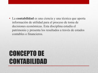 El documento habla sobre la contabilidad. Explica que la contabilidad es una ciencia y técnica que provee información para la toma de decisiones económicas, estudiando el patrimonio y presentando resultados a través de estados financieros. Su objetivo principal es conocer el estado financiero de un negocio para evaluar su rendimiento y poder sobrevivir, ser rentable y crecer. La contabilidad es importante para medir recursos, reflejar derechos, controlar propiedades y mantener registros de manera eficiente. Existe diferentes tipos de contabil
